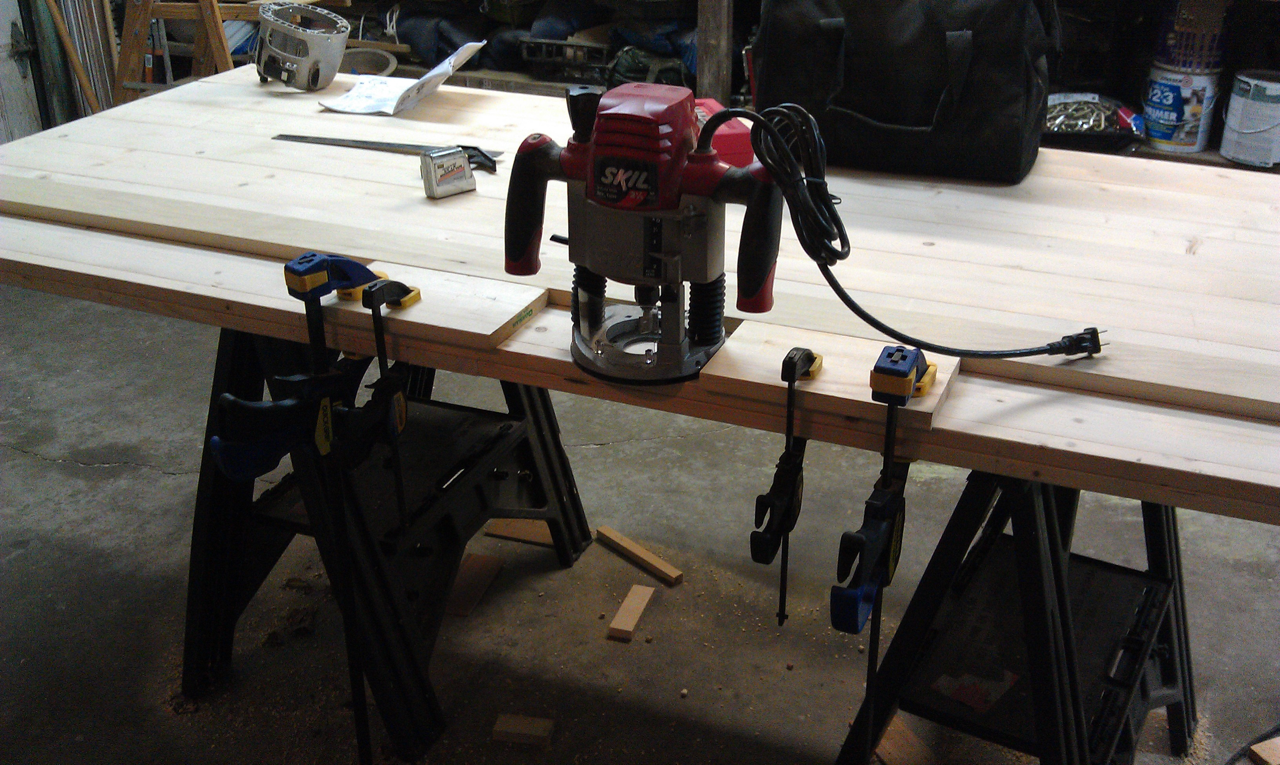 The first cut. The location was somewhat arbitrary, but I did have rough ideas where the top and bottom would be when I joined the back plan boards. As an aside, I love that 6-foot straight edge.