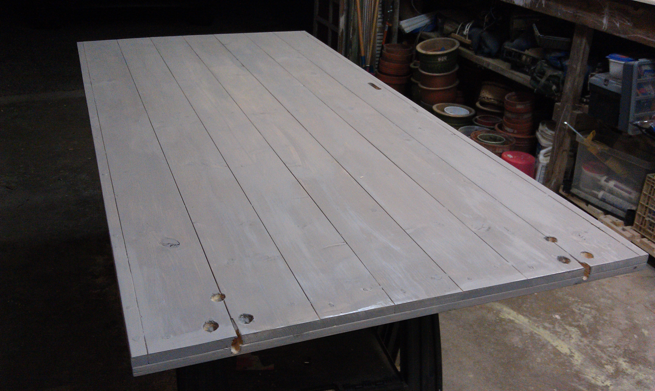 First go at how the boards will line up. Since I used rough pine there's a fair bit of variation in the wood as you can see.